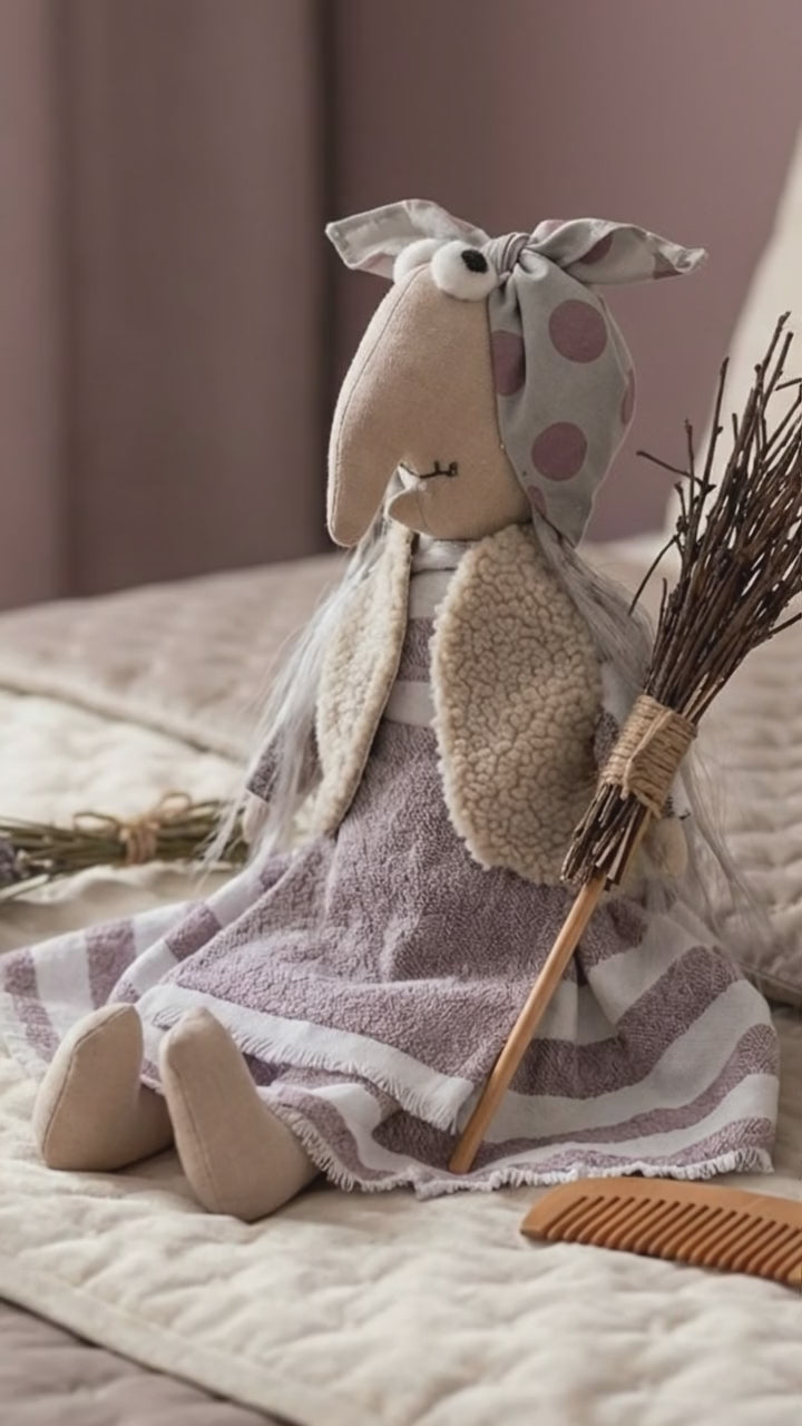 Ši rankų darbo ragana pasiūta iš natūralių audinių, su kruopščiai apgalvotomis detalėmis ir švelniu, pasakišku charakteriu. Tai ne tik žaislas, bet ir simbolis ramybės, jaukumo ir namų magijos.